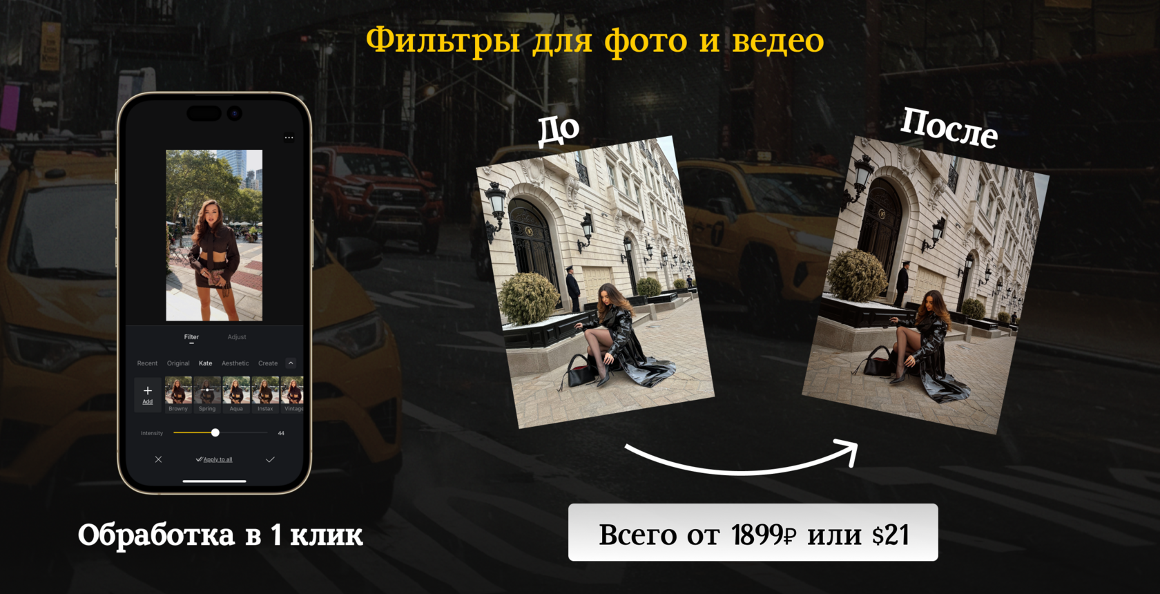 - Легкость обработки: Фото и видео обрабатываются мягко и быстро. Один ползунок - и готово!