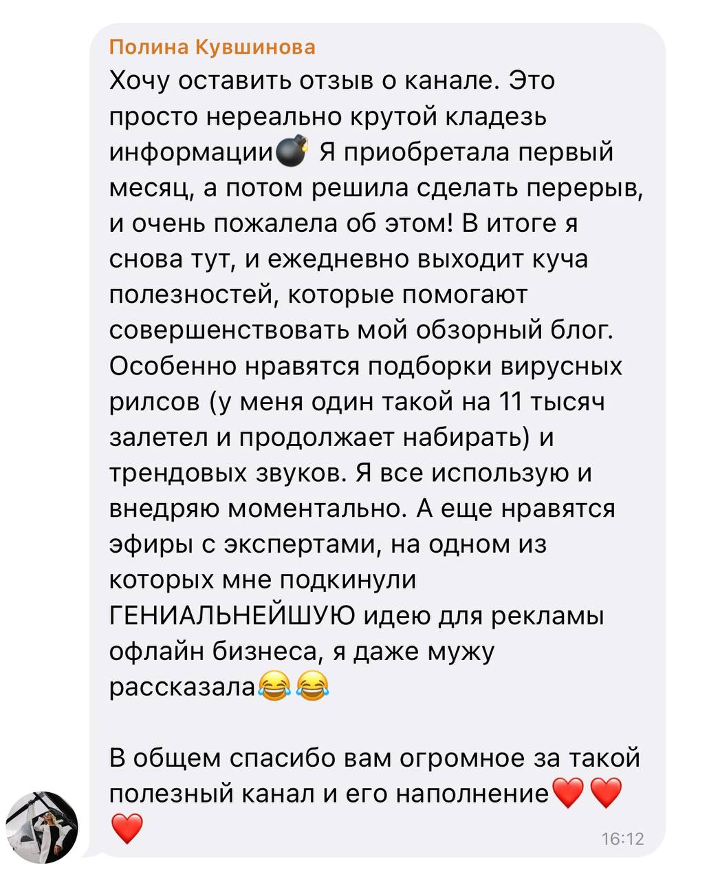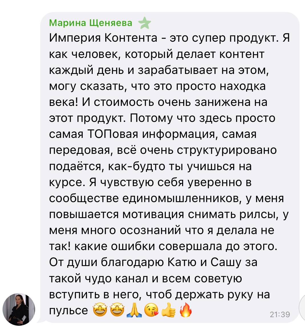 | | | | ✨Во-вторых, в отличии от разовых обучений, информация в канале постоянно обновляется. С ним вы можете держать руку на пульсе самых последних трендов, узнавать важные новости из мира блогинга и, конечно, слушать первыми мои подкасты, в которых я делюсь наблюдениями, мыслями и инсайтами. Даже опытные контентмейкеры, называет канал – находкой века! В нём собрана самая ТОПовая информация, которую нигде больше не найти. | | | | 🤍«ИМПЕРИЯ КОНТЕНТА» – это не только закрытый канал, но и сообщество единомышленников, которых часто так не хватает в жизни. В нем вы найдете поддержку, мотивацию прокачивать свой блог и вдохновение, чтобы делать это регулярно и без выгораний.